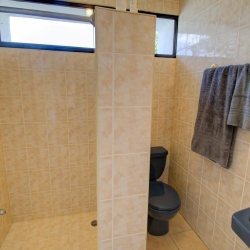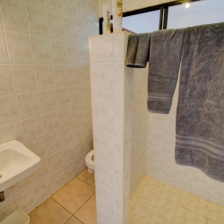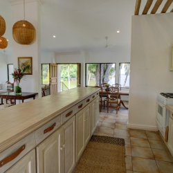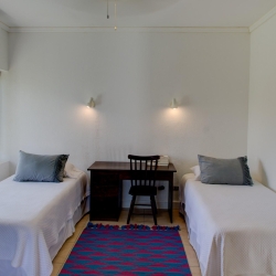 Inside the house, you’ll find a spacious living room with a dining area and a fully equipped kitchen. The bedrooms are arranged as follows: the master bedroom has a king-size bed and a single mattress, while the other two bedrooms each have three single beds.